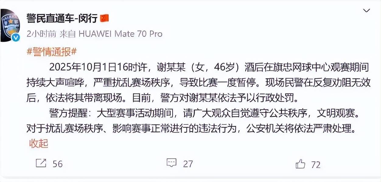 当晚,上海市公安局闵行分局迅速发布警情通报,明确表示已依法对谢某某处以行政处罚,并再次强调大型赛事需要所有观众遵守公共秩序。值得注意的是,早在9月24日,赛事官方就已通过社交媒体发布了观赛礼仪指南,其中明确规定“比赛过程中切忌大声喊叫影响球员发挥”等规则。从现场处置流程来看,主裁判率先提出离场要求,民警及安保人员在反复劝阻无效后才启动强制带离,完全符合《大型群众性活动安全管理条例》中“教育与处罚相结合”的原则。这种处置方式避免了矛盾的激化,并通过明确的执法行为维护了赛事秩序,得到了现场观众的积极认可。