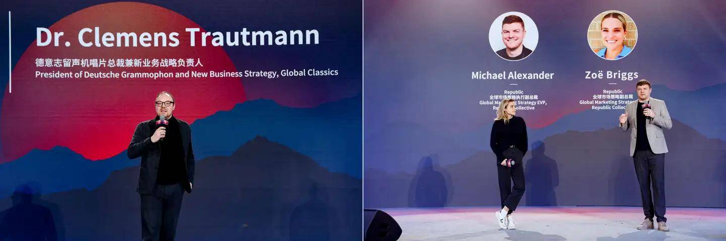 在本次环球音乐的推介会上,包括德意志留声机唱片总裁兼新业务战略负责人Dr. Clemens Trautmann;Republic厂牌联合体全球市场策略执行副总裁Michael Alexander及全球市场策略副总裁Zoë Briggs;以及环球音乐英国国际部中国市场负责人涂议嘉、环球音乐东南亚区A&R总监兼东南亚Def Jam副总裁David Tee、环球音乐泰国董事总经理/独立音乐厂牌What The Duck主理人Moy T、环球音乐越南董事总经理LK Phung、环球音乐越南A&R和市场总监Sean Doan等,他们都分别介绍了各自厂牌2026年重磅艺人矩阵与内容规划,涵盖了古典、流行、灵魂、电子等多元流派。